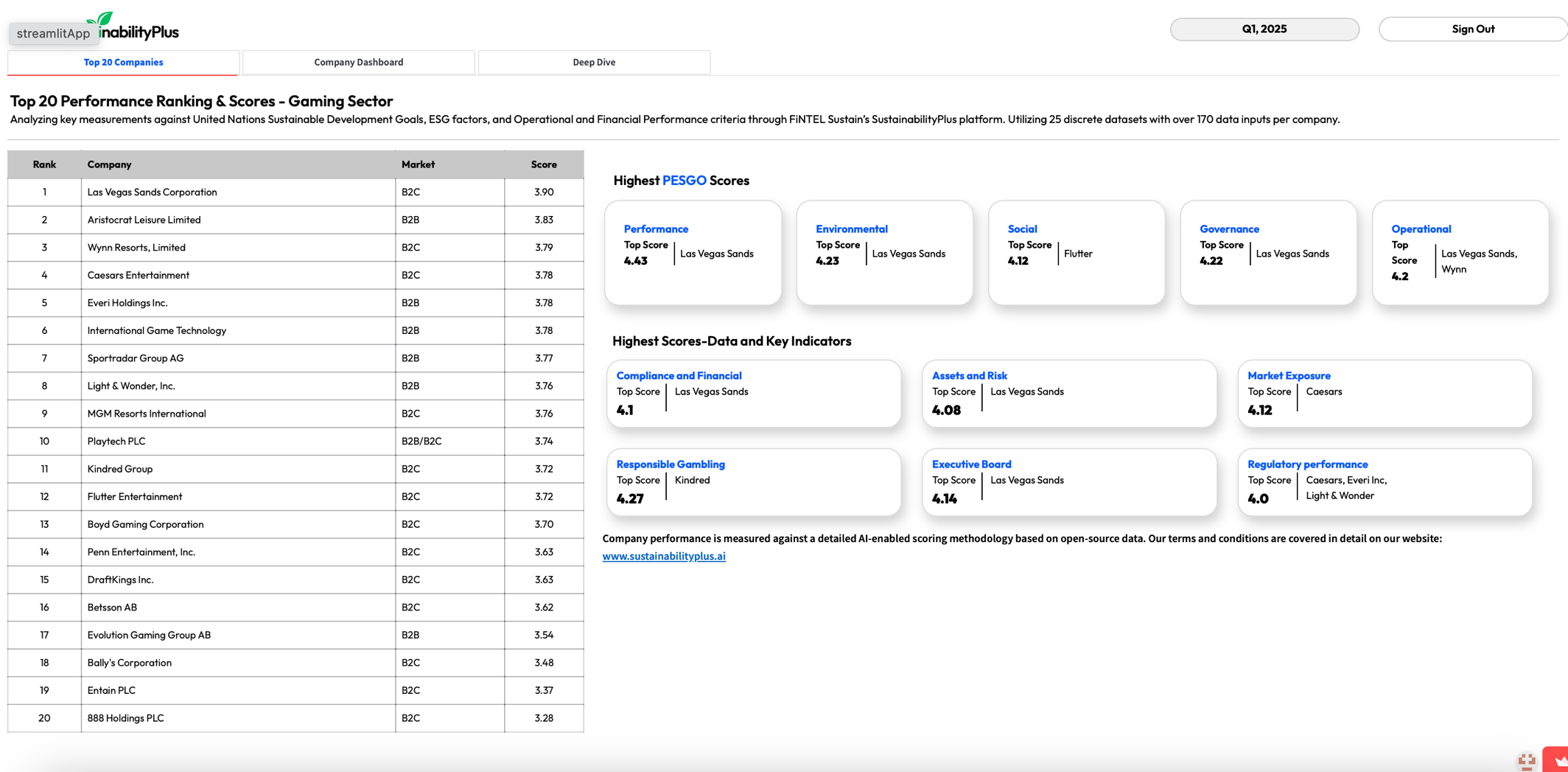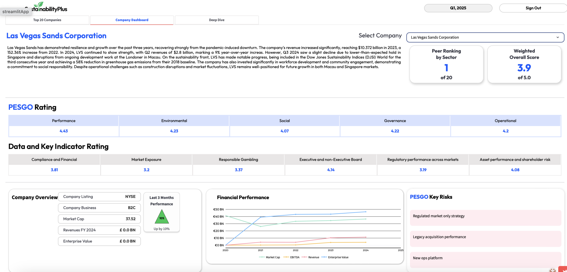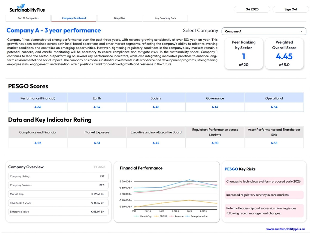Every quarter, member companies receive an updated report showing their latest rating and ranking. Companies access these reports via their dashboard and are able to download and use them to demonstrate their performance to investors, employees, regulators and other stakeholders. They include drop down menus in order to access detailed data on each of the PESGO score categories. PDF versions of the reports are also available.